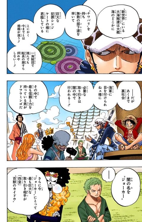 Trafalgar Law: “The great pirates of the New World all have their own territories somewhere on the seas, ruling over countless subordinates like massive criminal syndicates.” “The scale is completely different from anything before!! Even if a single pirate crew challenges them, you won’t even get to see the captain’s face…!!”