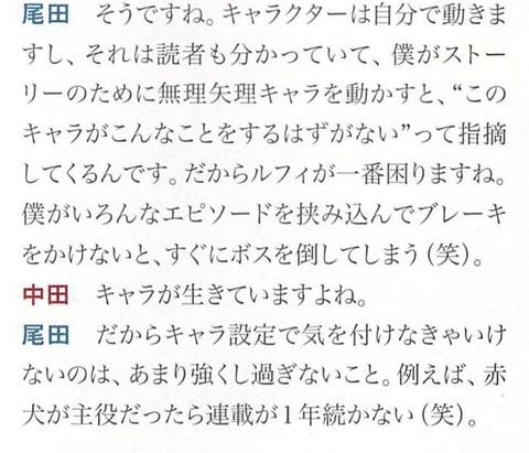 Oda: “Yeah. Characters move on their own. Readers understand that too, and if I force a character to act just to serve the story, they’ll immediately say, ‘There’s no way this character would do that.’ That’s why Luffy is the hardest to deal with.” “If I don’t slow him down by inserting various episodes, he’ll just beat the boss right away (laughs).”