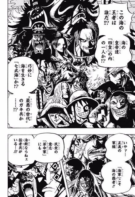 “Who is the true ruler of the seas!? One of the Sea Emperors — the Yonko!?” “The Seven Warlords, who survive the seas through cunning!?” “Or the brats of the Worst Generation……!?”