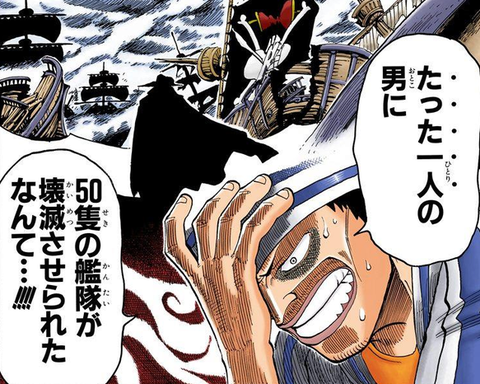 Krieg Pirates / Chief Combat Commander Gin: “By just one man… (Mihawk)” “Our fleet of 50 ships was completely wiped out…!!!!”