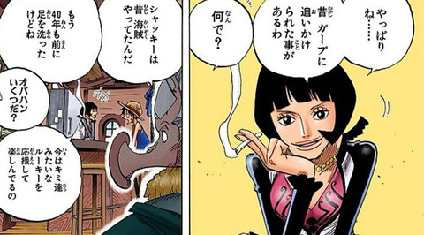 Shakuyaku “Just as I thought… I was chased by Garp once, a long time ago.” Monkey D. Luffy “Why?” Hatchan “Shakky used to be a pirate.” Shakky: “That was over forty years ago, though. I quit.” Luffy: “How old are you, lady…? (sweat)” Shakky: “Now I just enjoy cheering on rookies like you.”