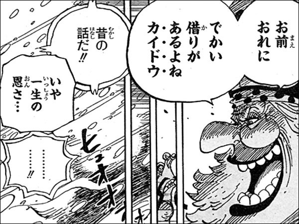 Charlotte Linlin / Big Mom: “You owe me a huge debt, don’t you… Kaido?” Kaido: “That’s ancient history!!!” Big Mom: “No. A debt for life…” Kaido: “………………!!”
