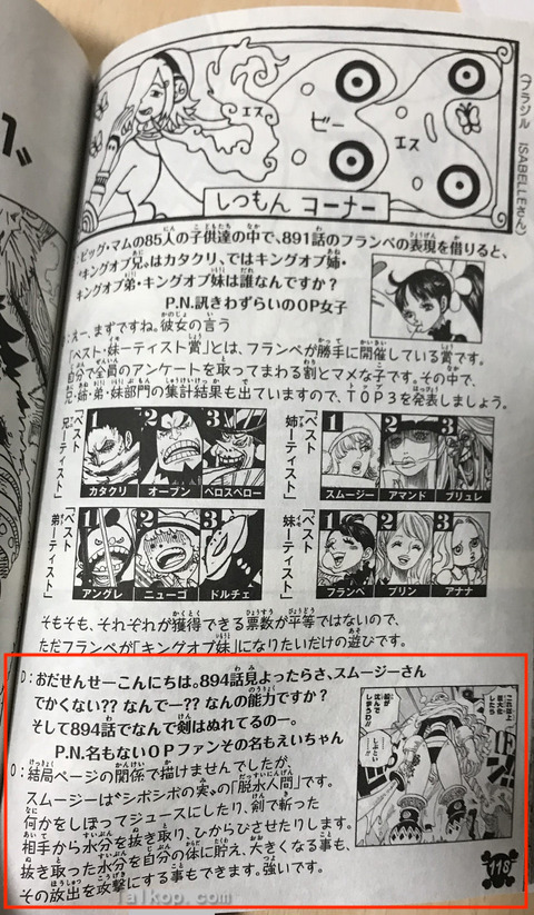 Hello, Oda-sensei. While I was reading Chapter 894, I noticed something — isn’t Smoothie really huge?? Why is that? What kind of ability does she have?? And also, why is her sword wet in Chapter 894?