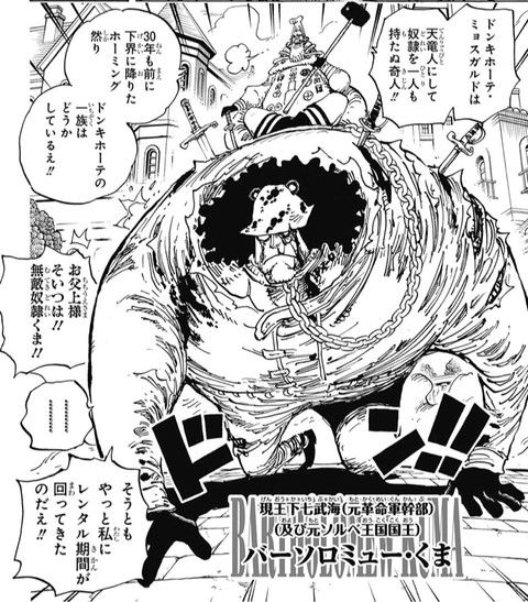 454: Anonymous Pirate. 2018/06/14 Not sure about their relationship, but maybe Kuma became a cyborg in exchange for Bonney? Bonney’s age-manipulation power feels insanely important. They might’ve wanted to test where Devil Fruit powers reside — body or soul.