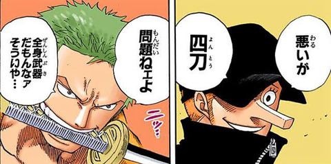Kaku “Sorry, but I fight with four swords.” Roronoa Zoro “No problem. My whole body’s a weapon anyway… now that you mention it.”