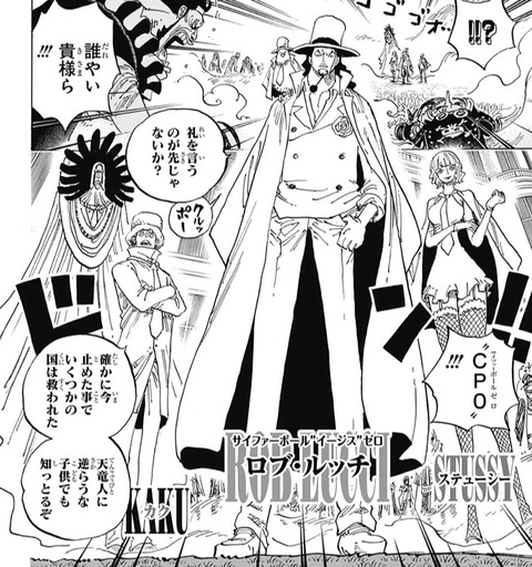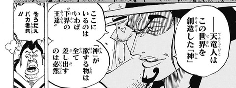 Rob Lucci “The Celestial Dragons are the ‘gods’ who created this world. Those gathered here are, so to speak, the ‘kings of the lower realm.’ It’s only natural that everything the ‘gods’ desire be offered to them.”