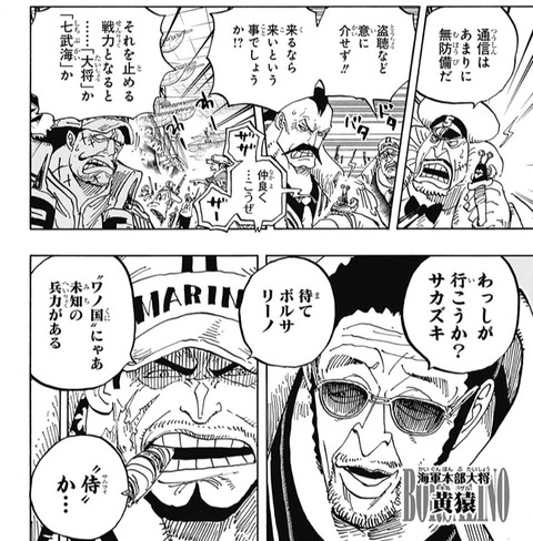 Sakazuki / Akainu: “Wait, Borsalino. There are unknown military forces in Wano.”