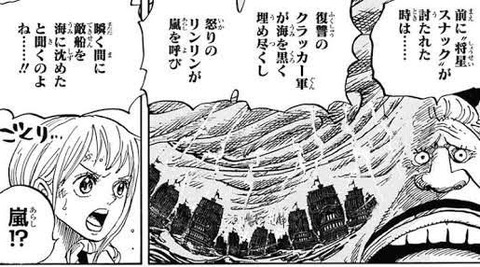 Pound: “I heard that when one of the Sweet Commanders was defeated before… the vengeful Cracker army blackened the sea, an enraged Linlin summoned a storm, and the enemy fleet was sunk in an instant…!!”